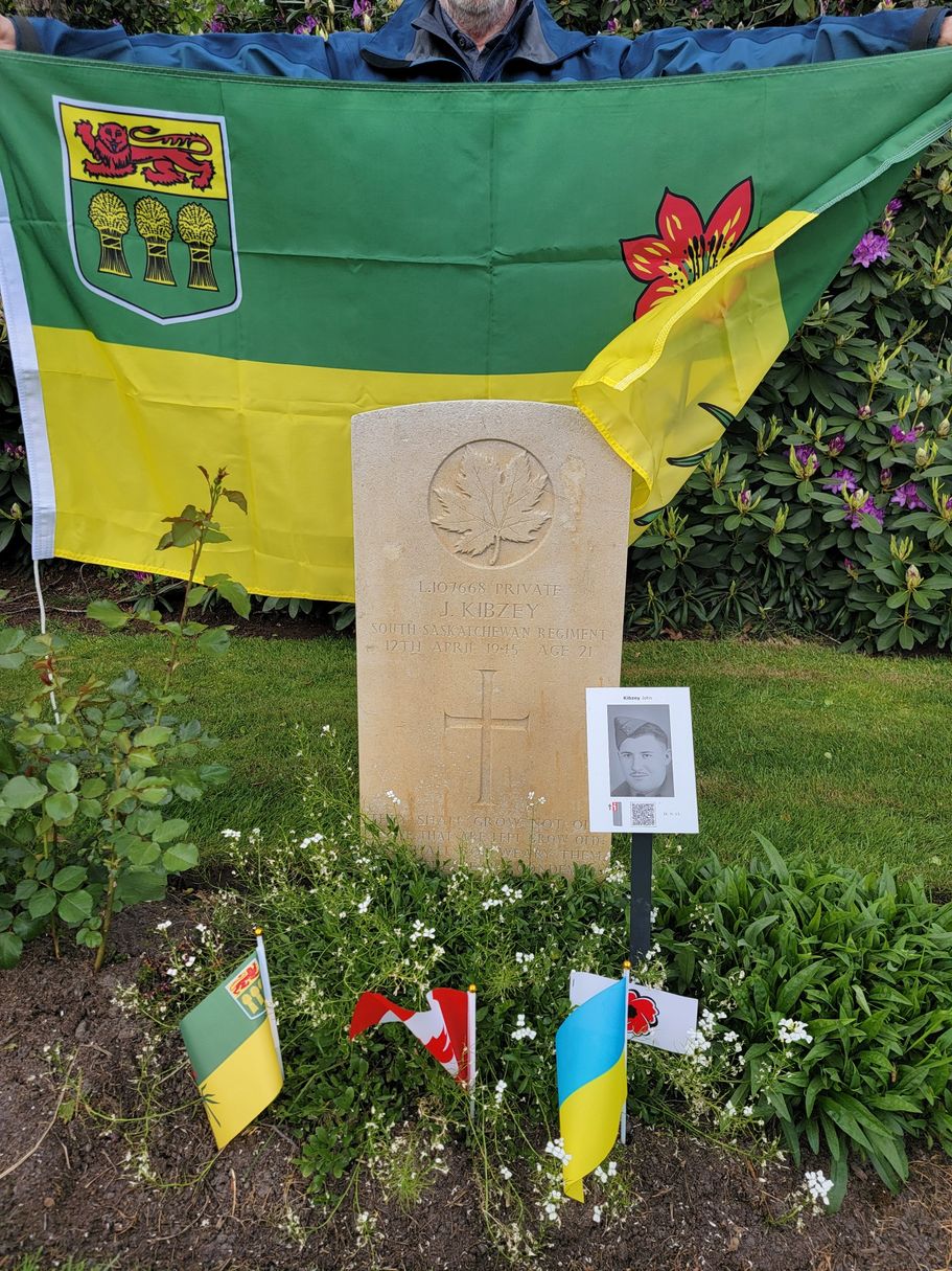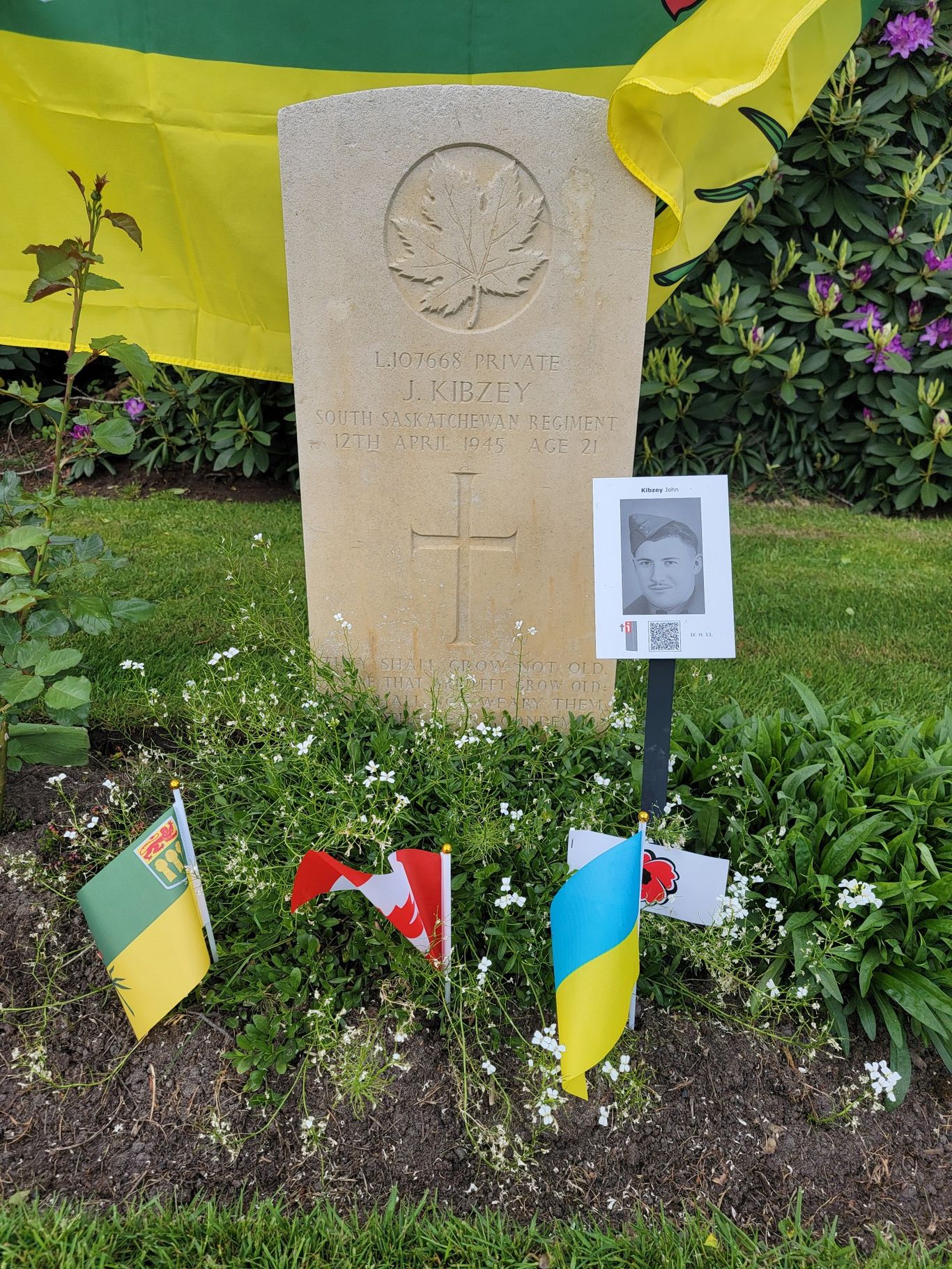 The banner of Private John Kibzey flew this year. I also had the privilege to be able to visit his grave in the Holten Canadian War Cemetery in the Netherlands this May and plant flags and his photo to pay tribute to him and his sacrifice. (more photos about John below.)